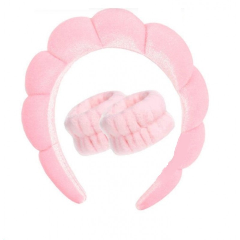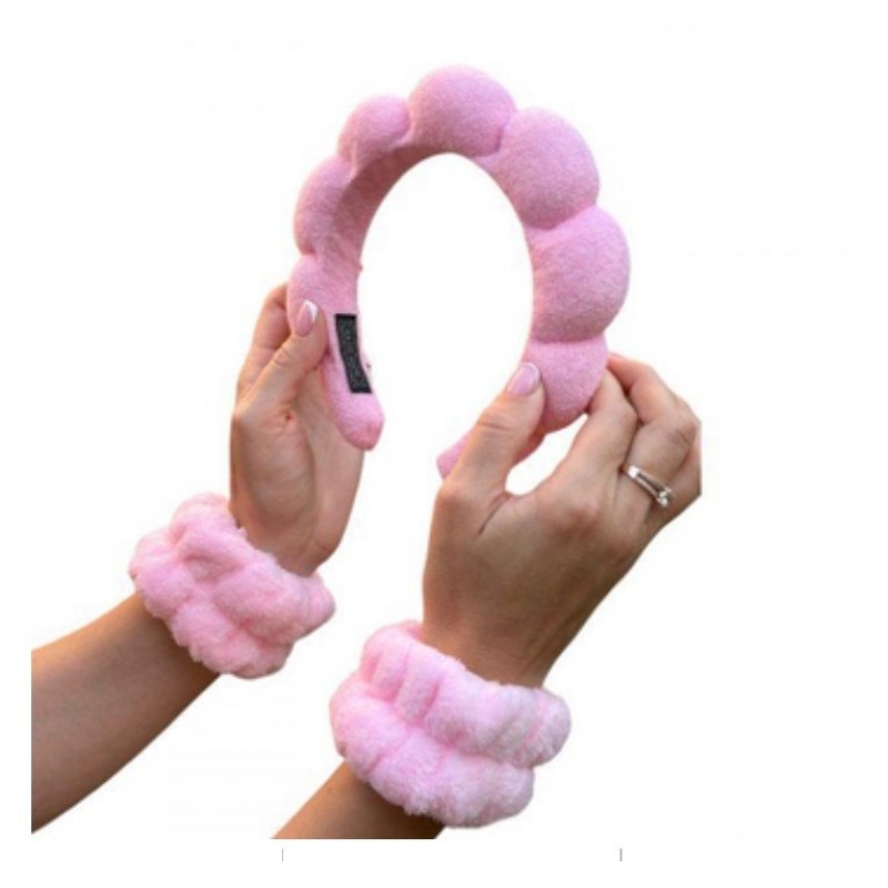 рожевийНабір для догляду та б'юті процедур призначений для того, щоб прибрати та зафіксувати волосся. А також щоб при вмиванні вода не стікала по руках, на одяг. Аксесуари запобігають попаданню води на зачіску, а також на руки вище зап'ястя. Пов'язку також зручно використовувати під час масажу, тренування, прийому ванни або походу в сауну.
