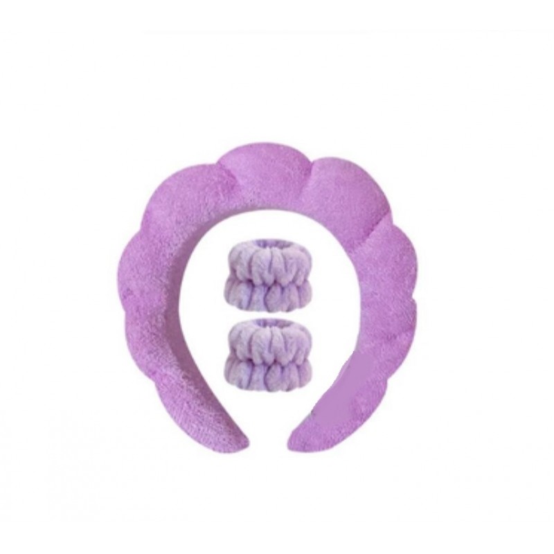 бузковийНабір для догляду та б'юті процедур призначений для того, щоб прибрати та зафіксувати волосся. А також щоб при вмиванні вода не стікала по руках, на одяг. Аксесуари запобігають попаданню води на зачіску, а також на руки вище зап'ястя. Пов'язку також зручно використовувати під час масажу, тренування, прийому ванни або походу в сауну.