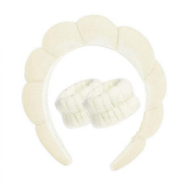 молочнийНабір для догляду та б'юті процедур призначений для того, щоб прибрати та зафіксувати волосся. А також щоб при вмиванні вода не стікала по руках, на одяг. Аксесуари запобігають попаданню води на зачіску, а також на руки вище зап'ястя. Пов'язку також зручно використовувати під час масажу, тренування, прийому ванни або походу в сауну.