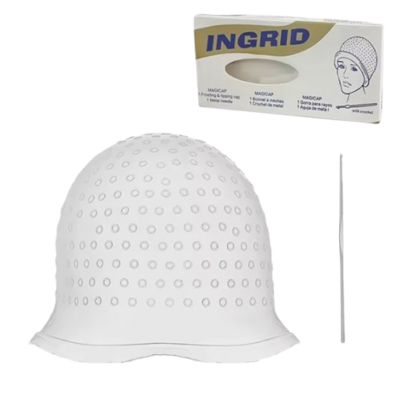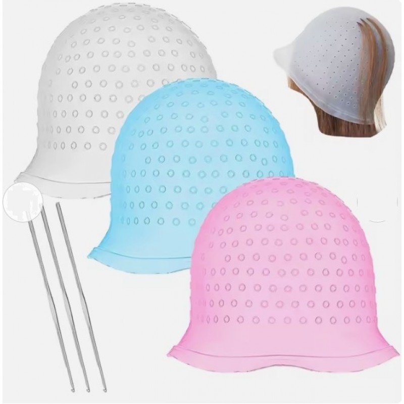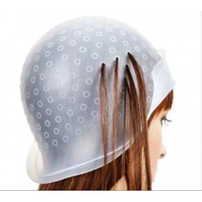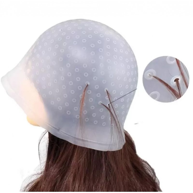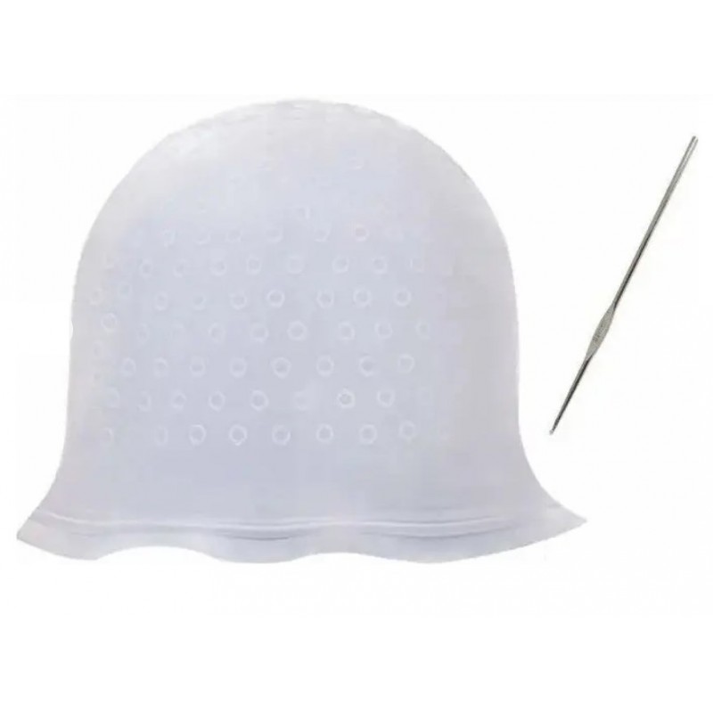Багаторазова силіконова шапочка – професійний аксесуар майстра-колориста, що дозволяє зробити фарбування та мелірування локонів, використовуючи гачок для витягування та виділення окремих пасм. Аксесуар допомагає уникнути помилок при фарбуванні волосся: розтікання фарби, сплутування фарбованого та незабарвленого пасма. Рекомендується для професійного використання, також може використовуватись і при домашньому фарбуванні.