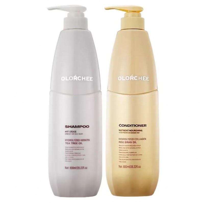 Шампунь Olorchee Anti Grease Shampoo з олією чайного дерева та гідролізованим кератином глибоко очищає, зменшує жирність і освіжає шкіру голови, а кондиціонер Olorchee Nutrient Nourishing Conditioner відновлює пошкоджені ділянки волосся, робить полотно гладкішим і еластичнішим.